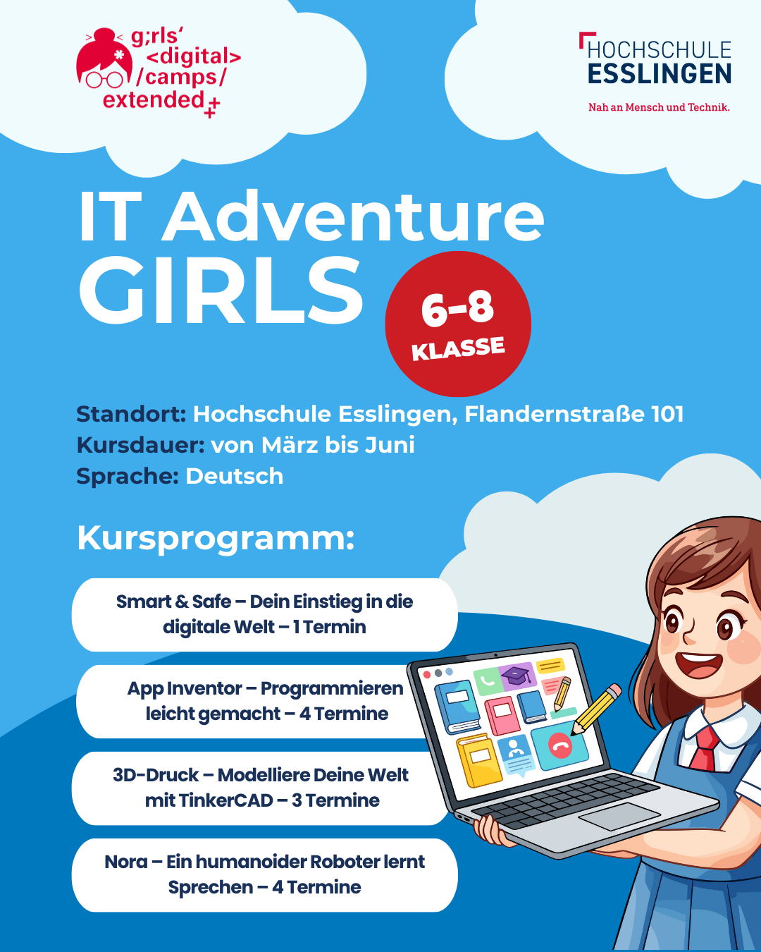 Der erste Schritt in die digitale Welt: Was ist IT, wie bewegt man sich sicher im Internet und schützt seine Daten? Die Mädchen lernen Passwörter, typische Hacker-Tricks und kreative digitale Tools kennen – ganz ohne Vorkenntnisse.